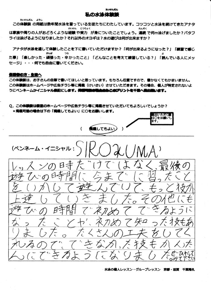 SIROKUMAさんは、お話をよく聞き,聞いたことを体で正確に表現しようとし,自由な発想で遊ぶ…私からすれば大変優秀なお子さんでした。おそらく水泳以外のシーンで良い体験や経験をされてきたのだと思います。実際に伝承遊び(昔から伝わる遊び)を高度なレベルまで習得されているとのこと。きっとそのレベルまで我慢強く何度も何度も繰り返して練習したのだと思います。その時の経験は他の分野にも広がりを持ち、難しい水泳のテクニック習得の際も、反復練習をすれば出来るようになる自分をイメージしやすかったのかもしれません。実際に、1000m遠泳,立ち泳ぎのテクニックを駆使したゲーム,水中でアクロバティックに回転…このような挑戦や遊びが出来るようになりました。遊びの延長線上に学びがあり、学びの延長線上に遊びがある…これは、レッスンの中でSIROKUMAさんが私に教えてくれたことです。